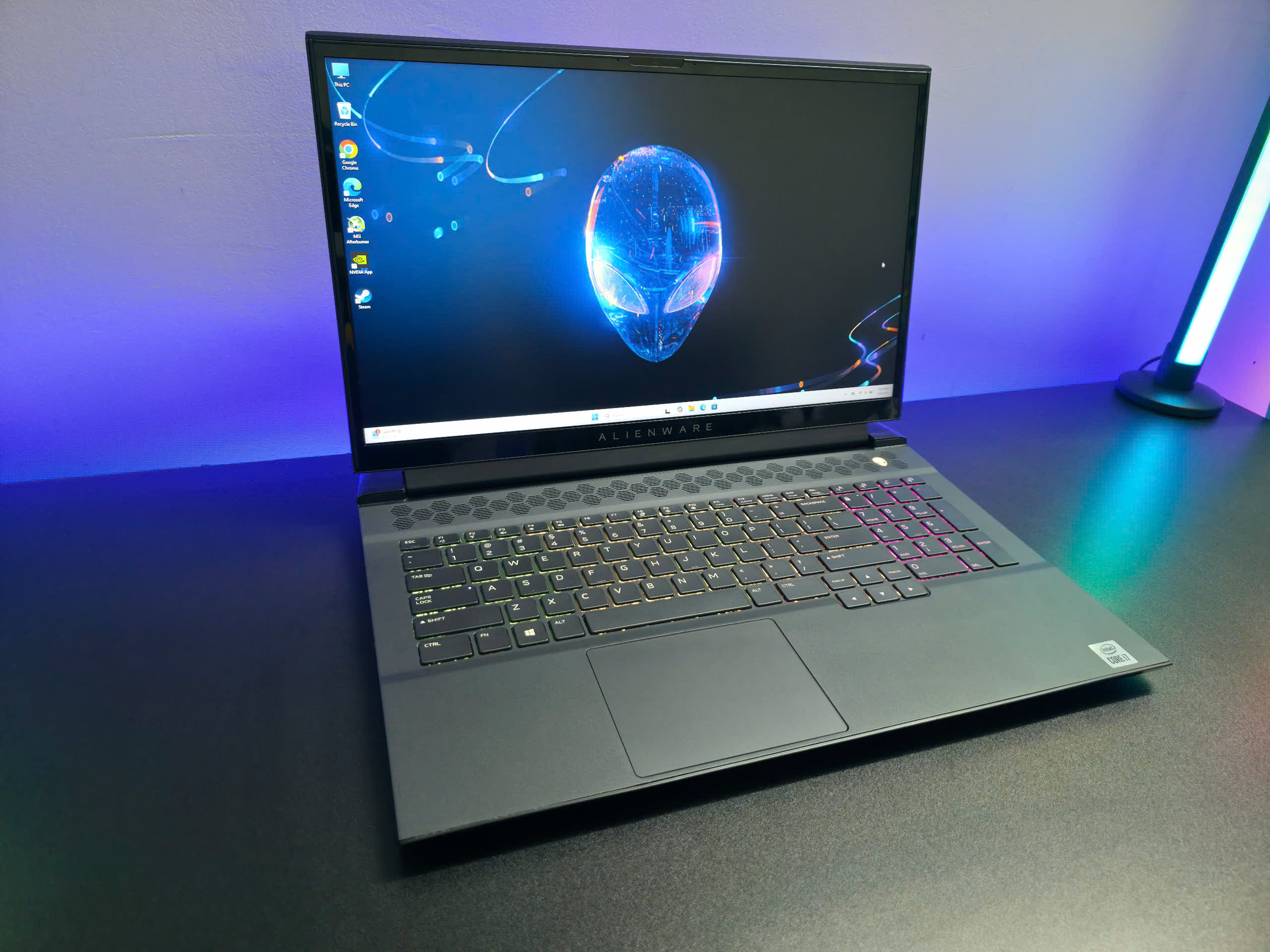 Và tất nhiên, có rất nhiều đèn RGB để làm sáng tỏ tâm trạng trong không gian bên ngoài. Bàn phím tiêu chuẩn có RGB bốn vùng. Và có đèn tùy chỉnh ở cạnh sau. Và trong đầu người ngoài hành tinh ở mặt sau của nắp và nút nguồn. Tuy nhiên, nâng cấp bàn phím tùy chọn và bàn phím cơ tùy chọn đều cung cấp ánh sáng cho mỗi phím.