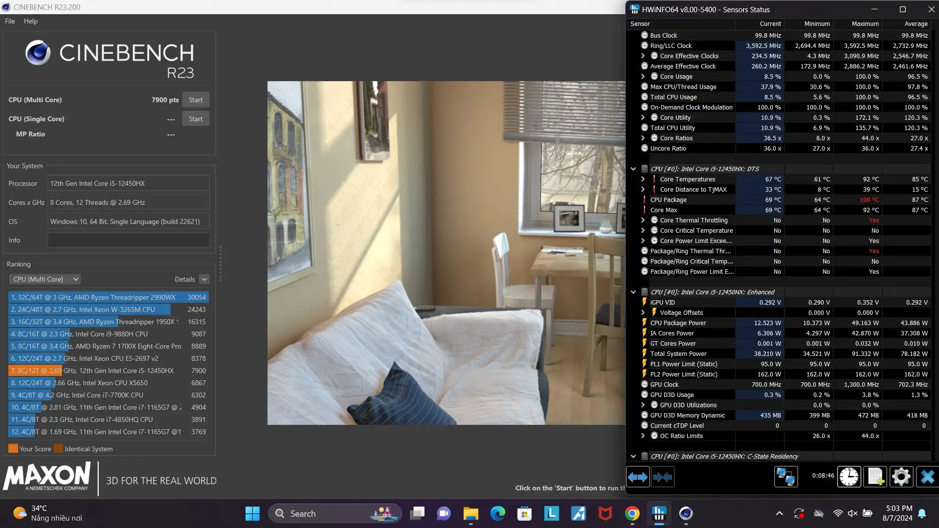 Điểm nổi bật đầu tiên của mẫu laptopLenovo LOQ 15IAX9 83GS001SVNchính là bộ vi xử lý Intel Core i5-12450HX, một lựa chọn hiệu năng cao dành cho game thủ. Dòng HX luôn là dòng CPU mang tới hiệu suất cực kỳ tuyệt vời cho những chiếc Laptop hiệu năng cao. Đạt được 7900 điểm trong bài kiểm tra Multicore của Cinebench R23, i5-12450H với 8 nhân 12 luồng thể hiện khả năng xử lý đa nhân mạnh mẽ cho các tác vụ chơi Game và làm việc mà bạn muốn sử dụng.
