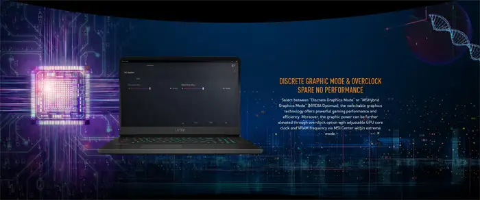 Chọn giữa “Chế độ đồ họa rời” hoặc “Chế độ đồ họa MSHybrid” (NVIDIA Optimus) chính là 2 tính năng công nghệ đồ họa có thể chuyển đổi mang lại hiệu suất và hiệu quả chơi game mạnh mẽ. Hơn nữa, sức mạnh đồ họa có thể được nâng cao hơn nữa thông qua tùy chọn ép xung với xung nhịp lõi GPU có thể điều chỉnh và tần số VRAM thông qua MSI Center trong chế độ khắc nghiệt.