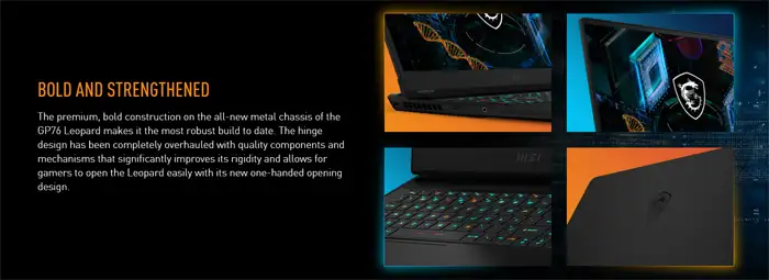 Cấu trúc cao cấp, táo bạo trên khung kim loại hoàn toàn mới của Laptop MSI GP76 Leopard 11UG 280VN đã khiến cho nó trở thành phiên bản Laptop Gaming chắc chắn nhất và bền bỉ nhất cho đến nay. Thiết kế bản lề đã được đại tu hoàn toàn mới với các thành phần và cơ chế chất lượng giúp cải thiện đáng kể độ cứng của nó và cho phép game thủ mở nó lên dễ dàng chỉ bằng một tay duy nhất.
