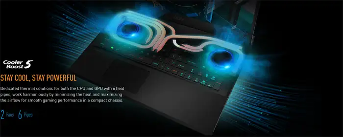 Các giải pháp tản nhiệt chuyên dụng cho cả CPU và GPU với 6 ống dẫn nhiệt, hoạt động hài hòa bằng cách giảm thiểu nhiệt và tối đa hóa luồng không khí để mang lại hiệu suất chơi game mượt mà trong một khung máy nhỏ gọn.