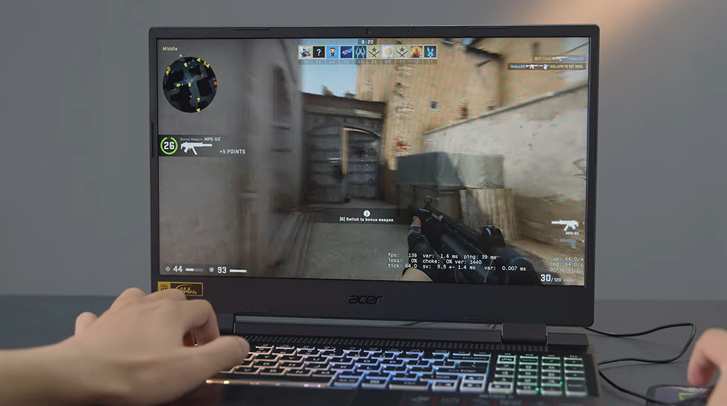 Nếu CS:GO đã quá dễ dàng thì mình quyết định chiến tiếp con game , tốc độ khung hình dao động từ55 – 63 FPSđồng thời thì nhiệt độ của GPU cũng như CPU vẫn còn khá mát mẻ, lần lượt nằm xấp xỉ ở mức58 độvà71 độkhi mình bật Nitro Sense ở chế độ cao nhất. Mức tiêu thụ điện năng trung bình nằm ở khoảng57 W – 67 W, được xem là không quá cao so với cấu hình của con game này.