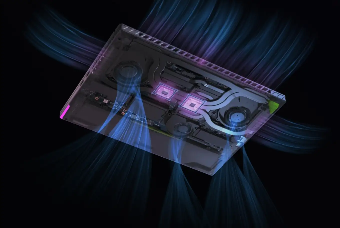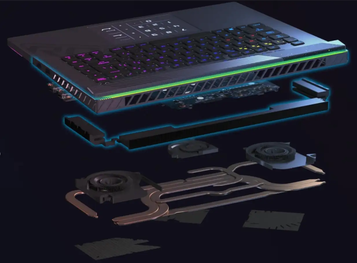 Để giải quyết được vấn đề thoát nhiệt với một hệ thống phần cứng quá mạnh mẽ, khung máy và bo mạch chủ đều được thiết kế lại một cách phù hợp. Các cổng kết nối phía sau đều đã nhường chỗ cho khe thoát nhiệt toàn phần. Các lá kim loại tản nhiệt thậm chí còn được đẩy sát ra khe thoát nhiệt để tối ưu khả năng giải nhiệt. Cụm tản nhiệt củaROG Strix G16 G614JV-N4455Wchiếm tới 174,183mm² diện tích bề mặt, tăng 71% so với thế hệ trước là ROG Strix G15 của năm 2022.