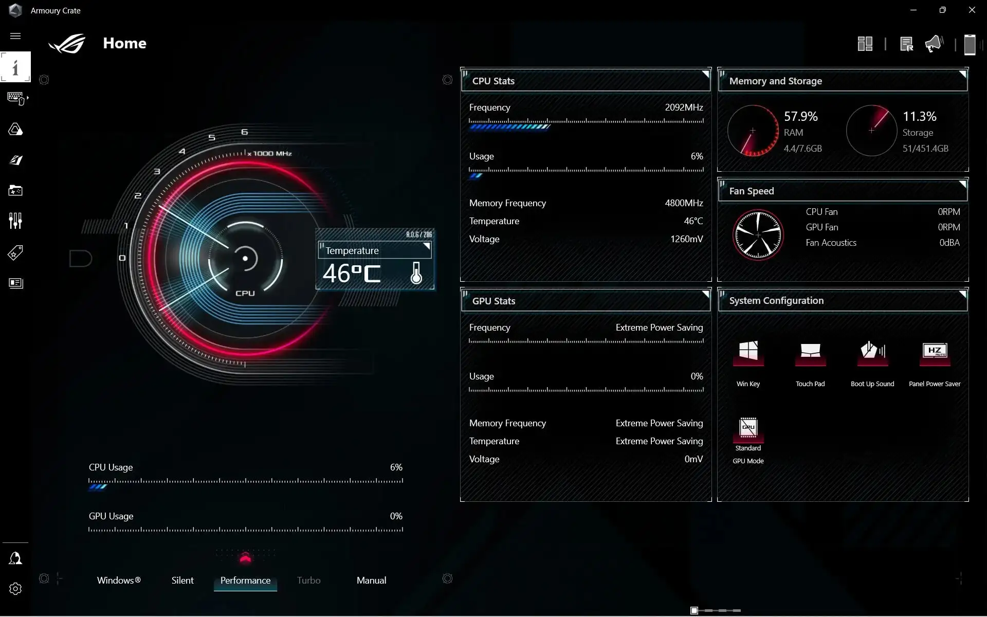 Khi bạn muốn tuỳ chỉnh các thông số hay cài đặt cá nhân thì Armoury Crate là công cụ đắc lực cho nhu cầu của bạn. Theo dõi nhiệt độ của bộ vi xử lý hay nhân đồ hoạ, điều chỉnh dòng điện đầu vào để đẩy cao sức mạnh phần cứng hoặc tiết kiệm điện tối đa, đồng bộ led RGB thông qua Aura Sync, v.v… đều được Armoury Crate đáp ứng dễ dàng.