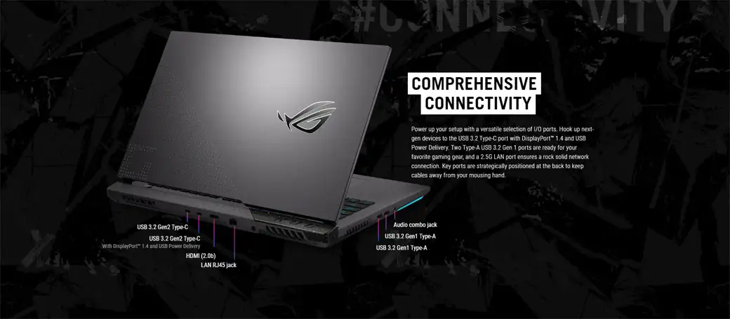 Tăng sức mạnh cho thiết lập của các bạn với nhiều lựa chọn cổng I/O linh hoạt. Kết nối các thiết bị thế hệ tiếp theo với cổng USB 3.2 Loại C với DisplayPort ™ 1.4 và USB Power Delivery. Hai cổng USB 3.2 Gen 1 Loại A đã sẵn sàng cho thiết bị chơi game yêu thích của các bạn và cổng LAN 2.5G đảm bảo kết nối mạng vững chắc. Các cổng chính được đặt ở vị trí chiến lược ở phía sau để giữ dây cáp tránh xa bàn tay di chuyển của các bạn. Đó chính là tất cả cổng cắm kết nối của chiếc ROG Strix G17 G713RW-LL012W mà nhà Asus muốn truyền đạt tới các bạn.
