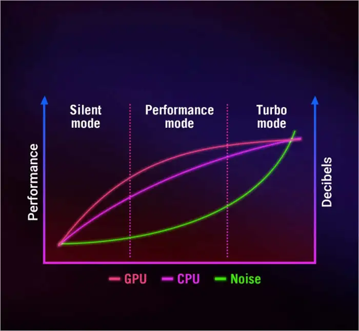 Nó bao gồm một Liquid Metal trên CPU với khả năng hạ nhiệt độ lên đến 16 độ C so với keo tản nhiệt truyền thống ngay từ lúc bắt đầu quá trình. 4 ổ cắm quạt đảm bảo máy tính xách tay có thể tự thoát nhiệt hiệu quả nhất có thể. Cấu hình phần mềm tùy chỉnh trải nghiệm với chế độ Im Lặng (Silent Mode) giữ cho độ ồn ở mức yên tĩnh trong các tác vụ nhẹ hơn và chế độ Hiệu Suất (Performance) hay Tăng Áp (Turbo) mở khóa sức mạnh máy tính xách tay của các bạn bằng cách tăng cả giới hạn công suất đồ họa và tốc độ quạt. Bất kể các bạn đang làm gì, các bạn có thể chọn sự cân bằng lý tưởng giữa công suất và âm thanh.