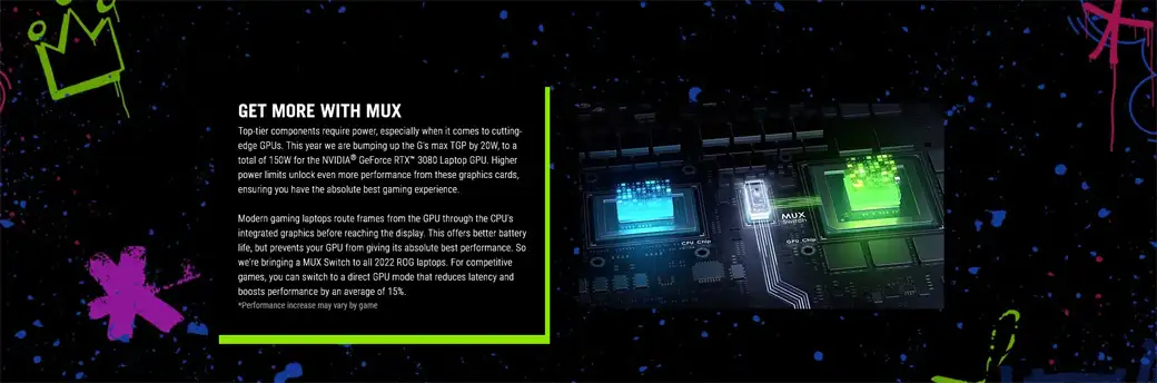 Máy tính xách tay chơi game hiện đại sẽđịnh tuyến khung hìnhtừ GPU thông qua đồ họa tích hợp của CPU trước khi đến màn hình. Điều này mang lại tuổi thọ pin tốt hơn nhưng ngăn GPU của các bạn mang lại hiệu suất tốt nhất tuyệt đối. Bởi vậy mà nhà ASUS đã quyết định mang tính năng công nghệ MUX Switch vào trong tất cả các máy tính xách tay ROG 2022. Đối với các trò chơi cạnh tranh, các bạn có thể chuyển sang chế độ GPU trực tiếp để giảm độ trễ và tăng hiệu suất lên trung bình 15%. Đó chính là ý nghĩa cơ bản mà các bạn cần phải biết về MUX Switch.