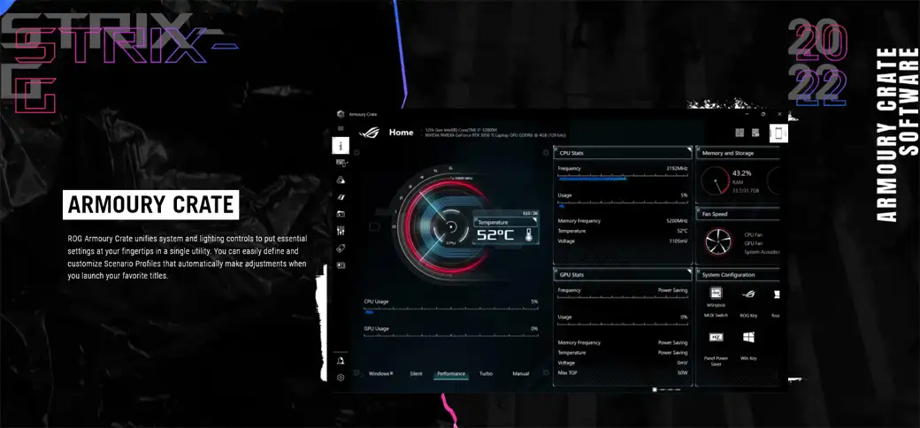 ROG Armoury Crate hợp nhất các điều khiển hệ thống và ánh sáng để đưa các cài đặt thiết yếu vào tầm tay của các bạn trong một tiện ích duy nhất. Như vậy, các bạn có thể dễ dàng xác định và tùy chỉnh Profiles tình huống một cách tự động để thực hiện các điều chỉnh khi bạn khởi chạy các tiêu đề yêu thích của mình.