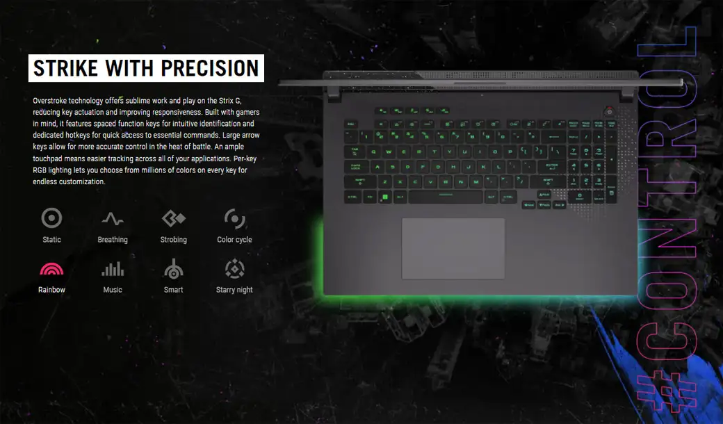 Công nghệ Overstroke mang đến khả năng làm việc và giải trí tuyệt vời trên Laptop Asus ROG Strix G17 G713RW-LL012W, giảm thao tác phím và cải thiện khả năng phản hồi. Được xây dựng dành cho người chơi game, Laptop Asus ROG Strix G17 G713RW-LL012W có các phím chức năng được chia ra cách nhau, để nhận dạng trực quan và các phím nóng chuyên dụng để truy cập nhanh vào các lệnh cần thiết. Các phím mũi tên lớn cho phép điều khiển chính xác hơn trong sức nóng của trận chiến. Bàn di chuột rộng có nghĩa là theo dõi tất cả các ứng dụng của các bạn dễ dàng hơn. Hệ thống chiếu sáng RGB trên mỗi phím cho phép các bạn chọn từ hàng triệu màu trên mỗi phím để tùy chỉnh vô tận.