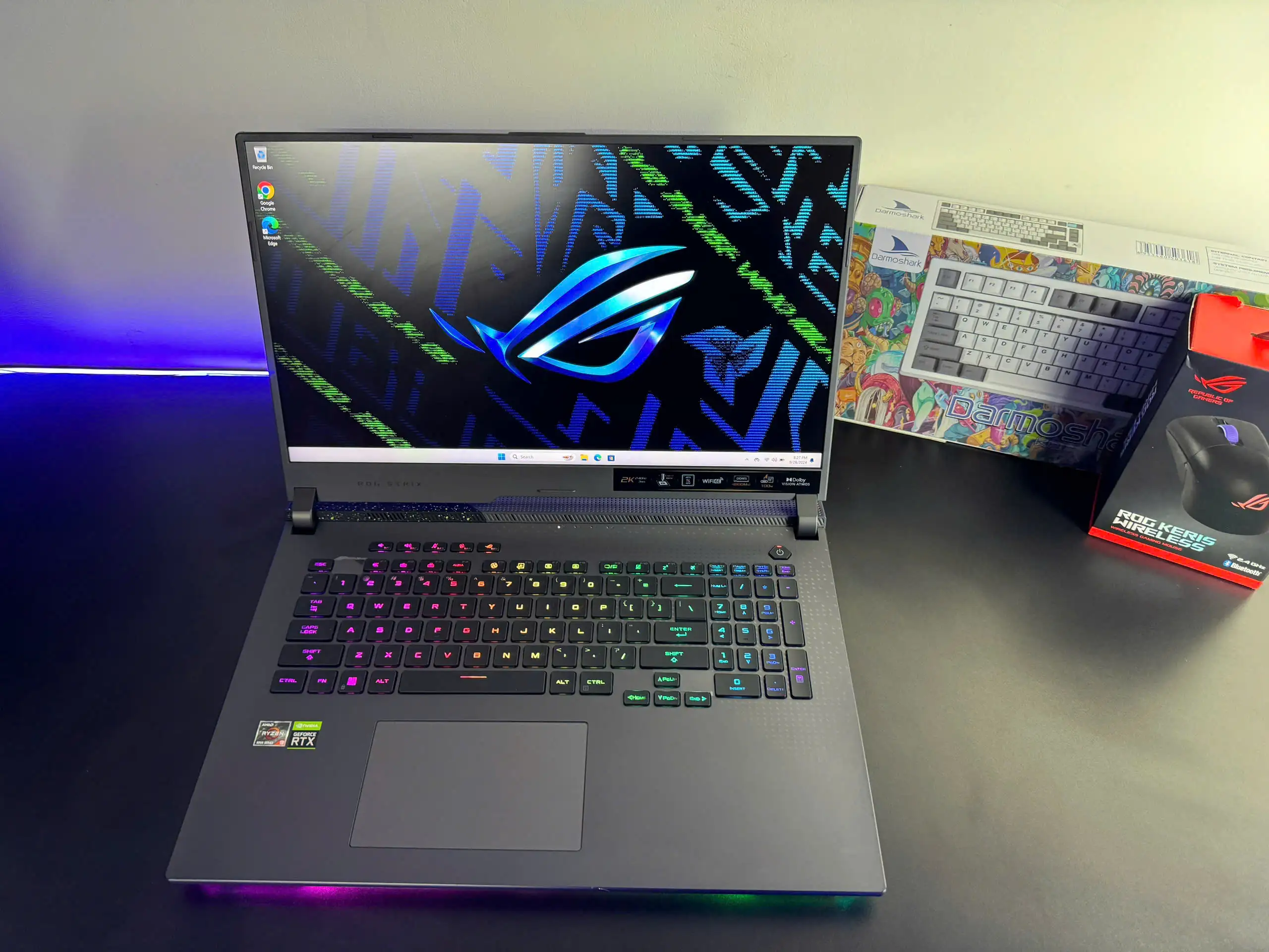 Và một thanh đèn chiếu sáng thêm một chút và có thể định cấu hình với Aura Sync. Thông qua việc ghép nối với bàn phím RGB đó, các bạn có thể chiếu sáng miền của riêng mình.