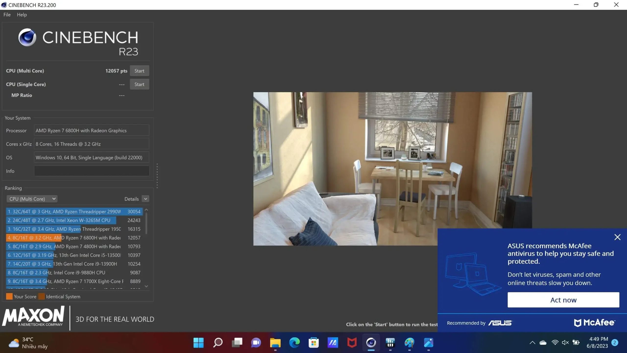 Kiểm tra hiệu năng render với phần mềm Cinebench R23. Trong bài test đa nhân, Ryzen 7-6800H đạt 12057 điểm, thể hiện hiệu năng cực kỳ mạnh mẽ.